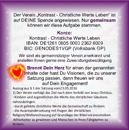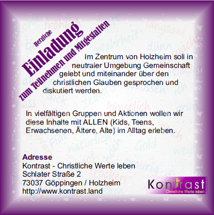 Fragen? Ansprechpartner: Heike und Gerhard Unterweger "Kontrast - Christliche Werte leben" e-mail: info@kontrast.land Impressum: Gerhard Unterweger Gustav-Rapp-Weg 3 73037 Göppingen 01712836536 | |