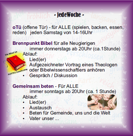 | -> mit Interessierten zum Austausch über Themen zum (christlichen) Glauben und zum Beten | |
